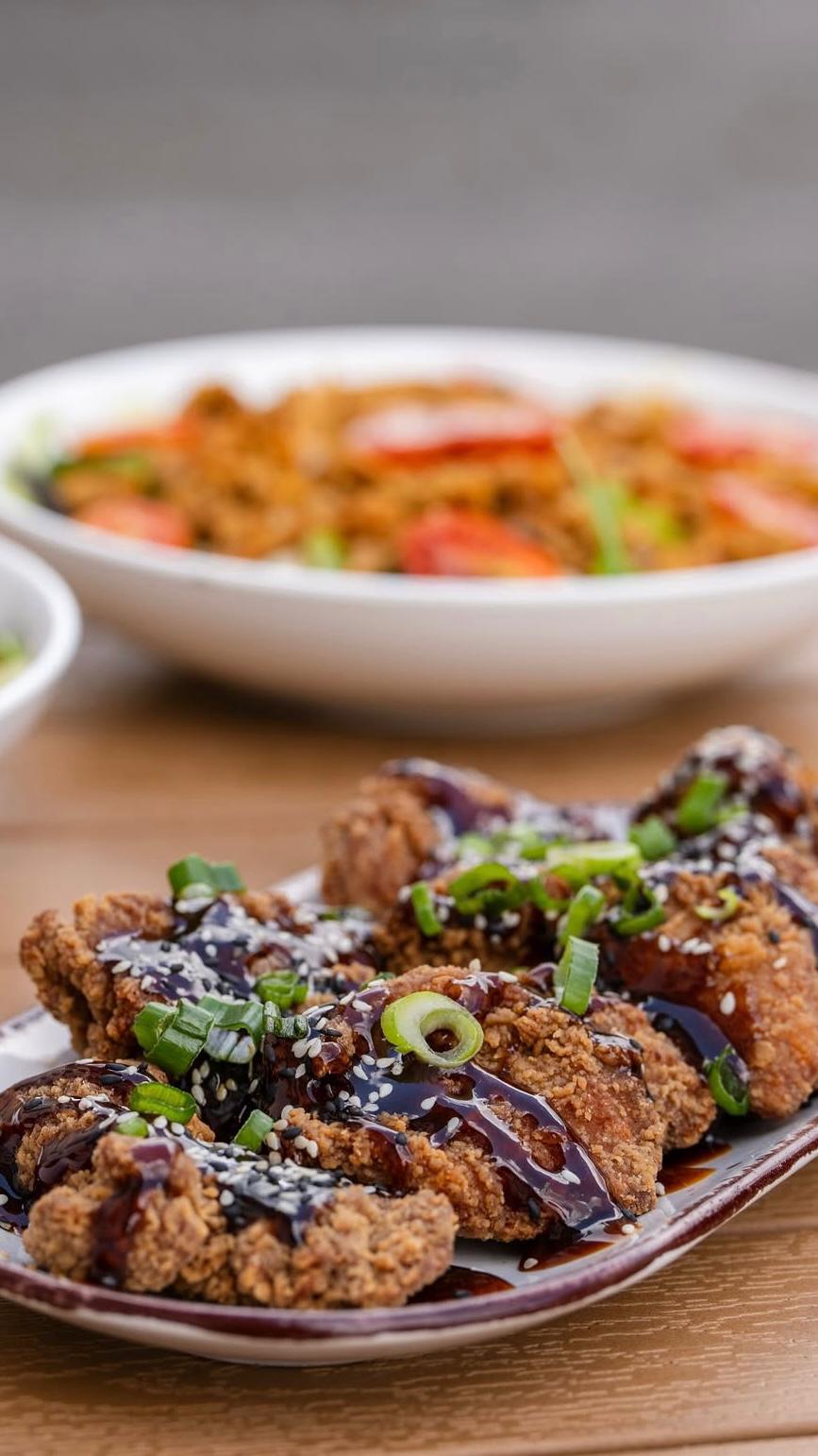 Korean Fried Chicken ist knusprig doppelt frittiertes Hähnchen, das besonders saftig bleibt und meist mit einer süß scharfen oder würzigen Sauce glasiert wird. Es zeichnet sich durch eine extra krosse Panade und intensiven Geschmack aus.