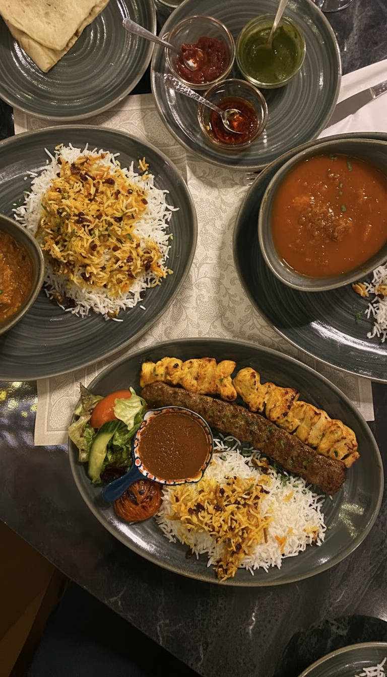 Im stilvollen Ambiente des Jadou Restaurants in München erlebst du die Vielfalt der persischen Küche in Form eines liebevoll zusammengestellten 3-Gänge Menüs. Bereits die gemischte Vorspeisenplatte mit frisch gebackenem Naan stimmt dich auf ein authentisches Geschmackserlebnis ein, bevor du aus einer Auswahl traditioneller Hauptgerichte wählst. Zart geschmorte Lammhaxe in Safransauce, fein mariniertes Lammfilet vom Grill, aromatische Hähnchengerichte oder raffinierte Kombinationen mit Kräutern, Granatapfel und Walnuss spiegeln die Tiefe und Eleganz der persischen Kochkunst wider. Dieses persische Menü in München verbindet hochwertige Zutaten, traditionelle Rezepte und eine warme Atmosphäre zu einem genussvollen Abend für Genießer.
