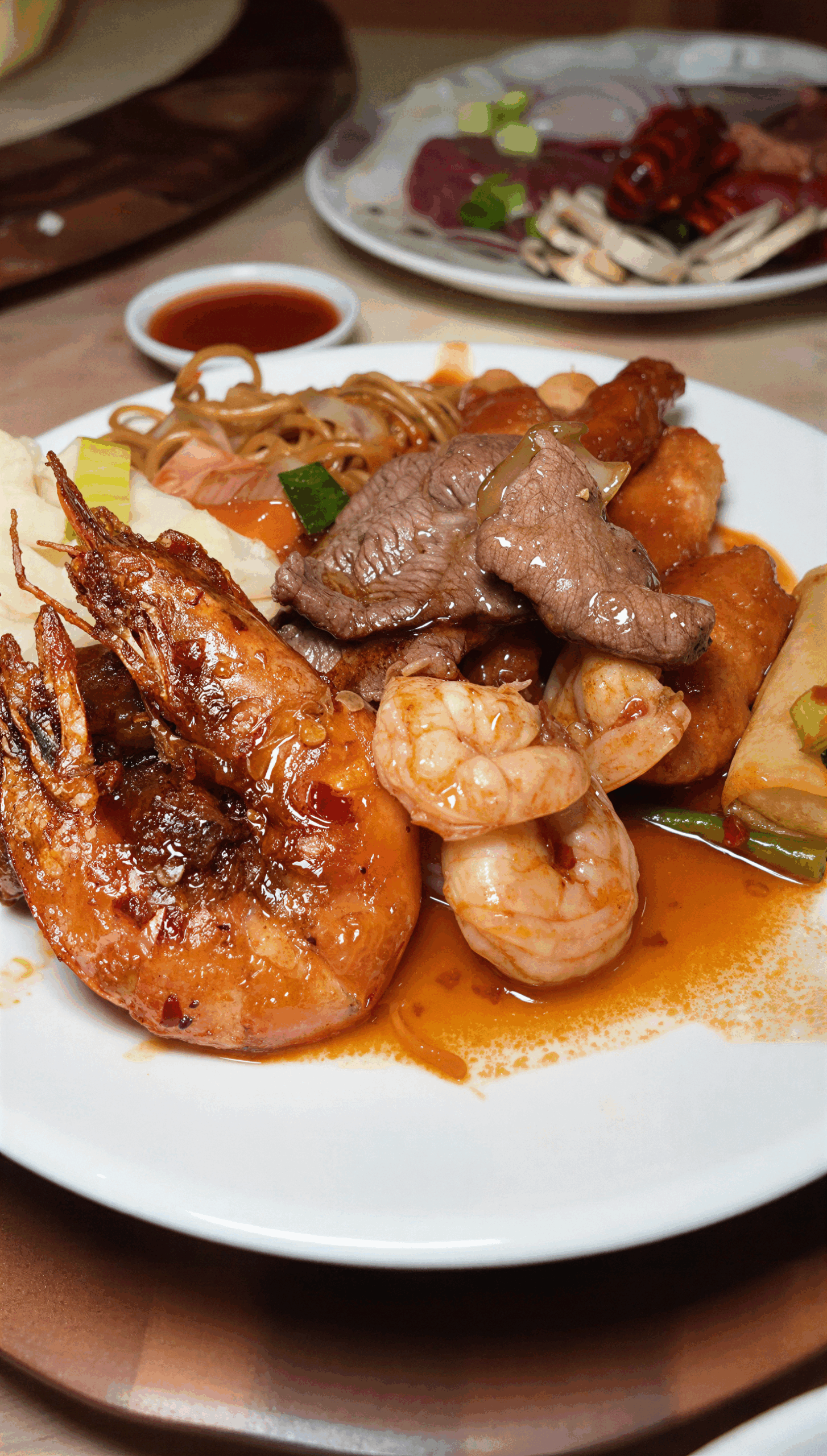 Buffet: große Auswahl aus asiatischen, mongolischen & chinesischen Gerichten, Sushi, Fisch, Meeresfrüchten und diversen Desserts.