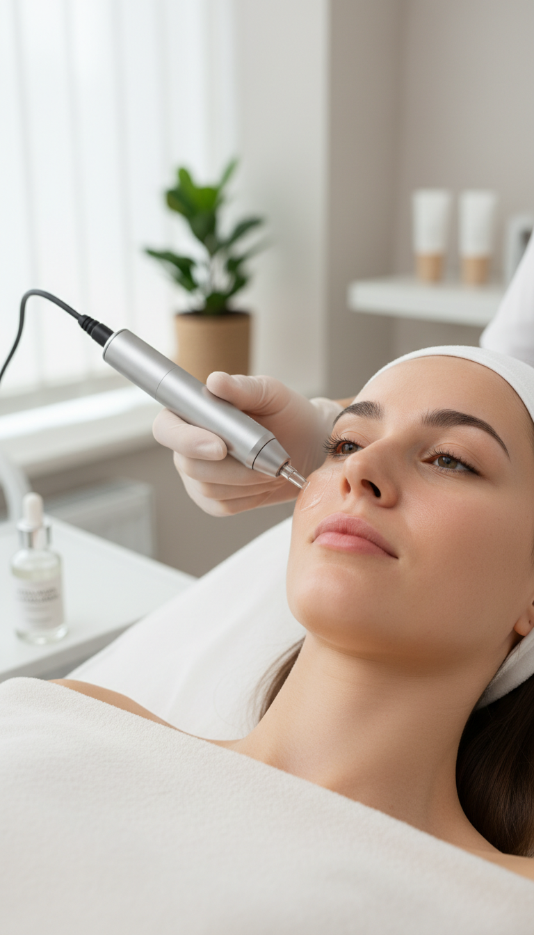 Option 1: Microneedling mit Kollagen und Hyaluron zur Unterstützung der Hautelastizität und Feuchtigkeitsbalance, mit Hautanalyse, Abreinigung, Wirkstoffeinschleusung, beruhigender Maske, beruhigendem Serum und Abschlusspflege.