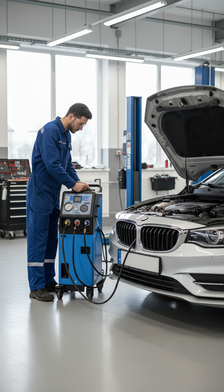 Klimaanlagen-Wartung: Dichtigkeitsprüfung durch Vakuumtest, Absaugen/ Desinfektion, Auffüllung bis 200g Kältemittel, für alle Pkw-Modelle/Automarken, Kältemittel R134a.