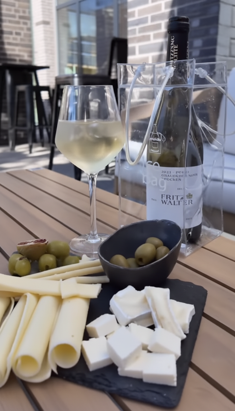 Option 1: 1 Flasche Riesling und 1 Käseplatte mit Brot und Oliven.