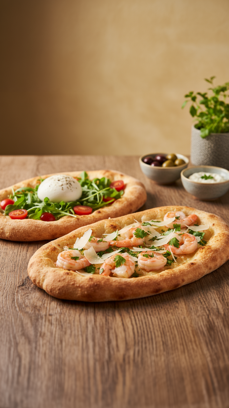 Auswahl aus: Burratapinsa, Garnelenpinsa, Shivas Special Pinsa, Greek Pinsa.