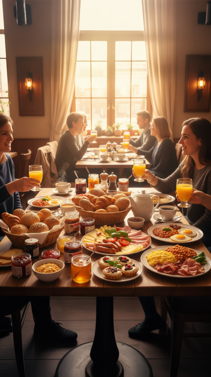 Kaffee-Flat – unbegrenzt frisch gebrühten Kaffee genießen, einen frisch gepresster Orangensaft je Person aus unserer Saftpresse, knusprige Brötchen (hell & Körner), Croissants, Auswahl an Marmeladen, hausgemachter Honig, Nutella und verschiedene Müslisorten, reichhaltige Wurst- & Käseplatten, feine Fischplatte, Rührei, Spiegelei auf Wunsch, Bacon, Nürnberger Würstchen, Bohnen in Tomatensoße, frische Tomate-Mozzarella-Platte und süße Leckereien zum Abschluss.